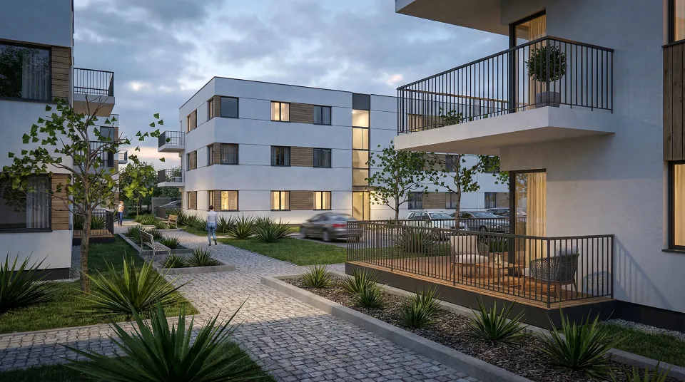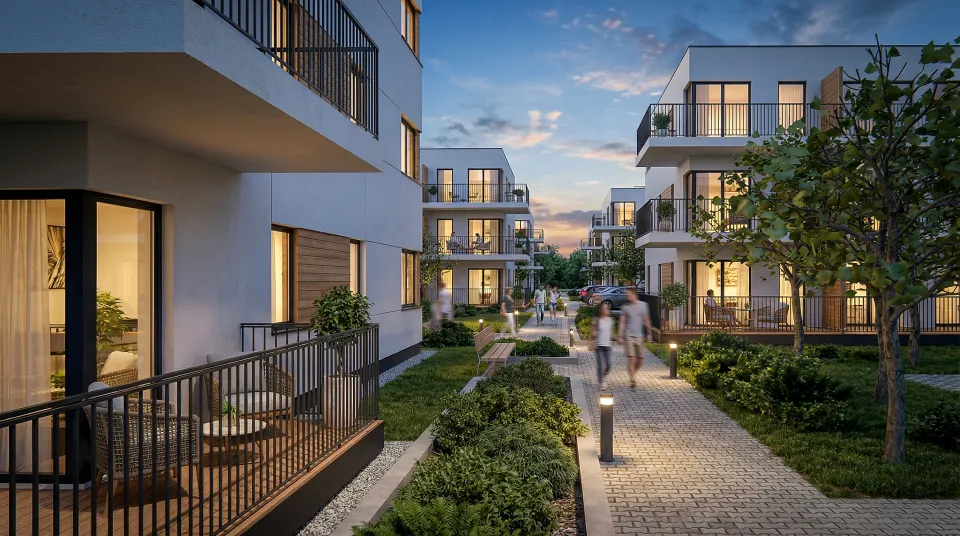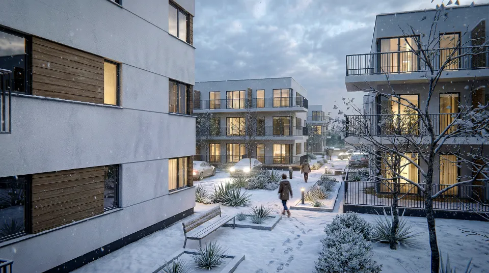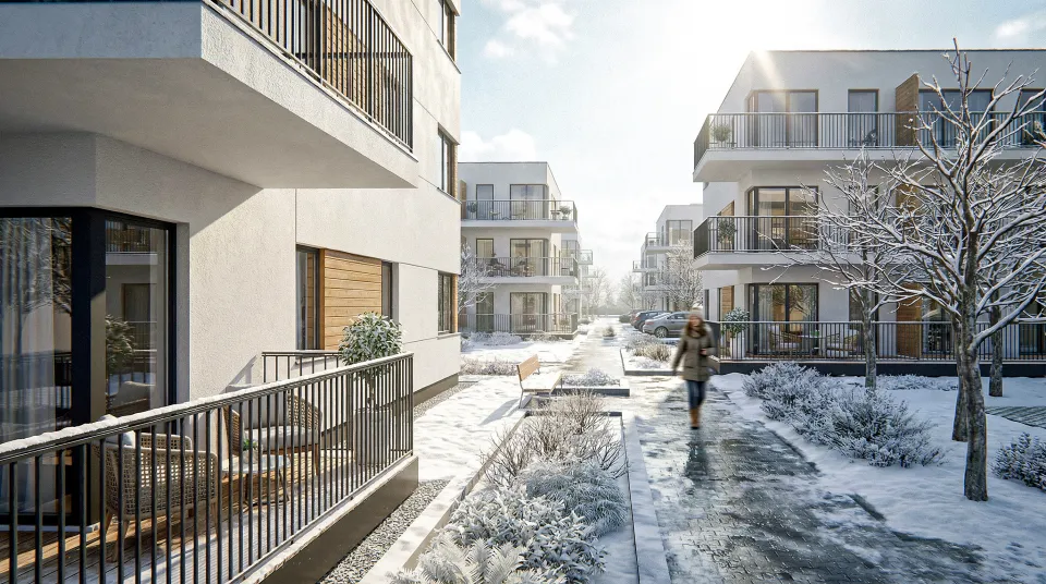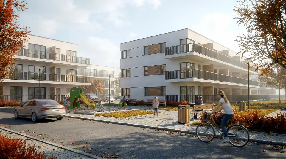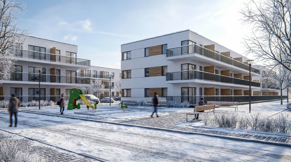 Poniżej prezentujemy wizualizacje ukazujące widok zewnętrzny projektowanego zespołu mieszkaniowego oraz Plan Zagospodarowania i rzuty budynków, wraz z układem funkcjonalnym lokali mieszkalnych.
