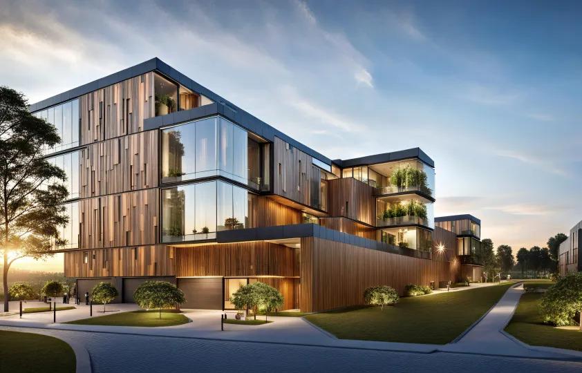 Zespół zabudowy mieszkalno - usługowej z garażami w parterach, będący przebudową i rewitalizacją terenów pofabrycznych.